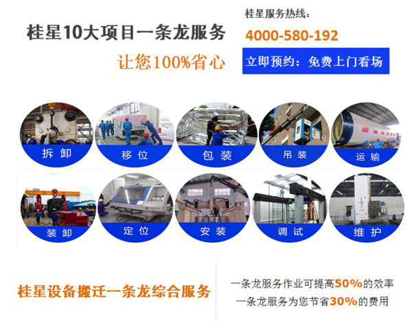 設(shè)備搬遷的解決方案制定好,上海桂星的服務(wù)流程是:拆卸、移位、包裝、吊裝、運(yùn)輸、裝卸、定位、安裝、調(diào)試、維護(hù),十大項(xiàng)目一條龍綜合服務(wù)。設(shè)備搬遷現(xiàn)場(chǎng),至少2名專家為你守護(hù),項(xiàng)目經(jīng)理+安全主任:0縫隙安全巡視 ,服務(wù)5000家客戶的安全歷練,常備3種以上應(yīng)急預(yù)案, 安全保障給您1萬(wàn)分放心。